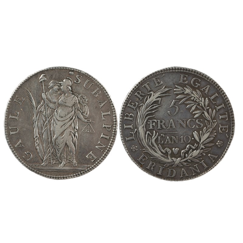 Piedmont - Republic: silver five francs, L'AN 10 (1802), standing figures with Liberty cap on pole, rev. value in wreath (KM C 4), good very fine.