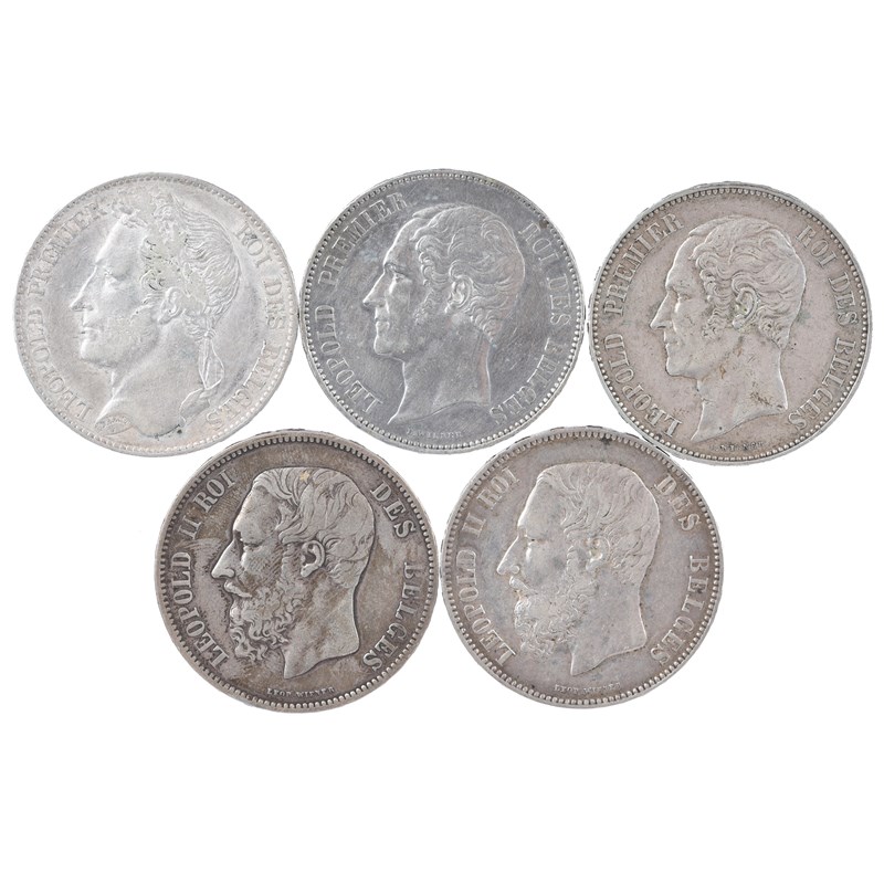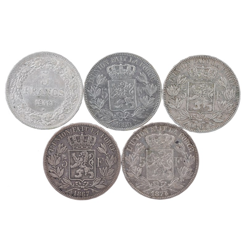 Belgium - Kingdom: Leopold I, silver five francs, 1848 (KM 3.2), good very fine; five francs, 1850, 1865 (KM 17), very fine; Leopold II, five francs, 1867, 1873 (KM 24), near very fine and extremely fine. [5]