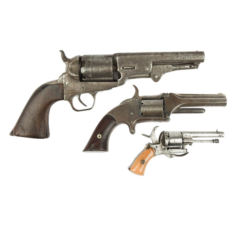Two American revolvers: the first of Colt percussion type, hexagonal barrel 5 in., open topped frame, six shot cylinder, marked '35 CAL'; the second a Smith and Wesson .32 rimfire Model No 1-1/2 first issue five shot revolver, tip-up barrel 3.5 in., serial number 17139, cylinder and hammer crudely modified for pinfire cartridges; together with a European 5mm six shot pinfire revolver, with folding trigger and horn grips. [3]