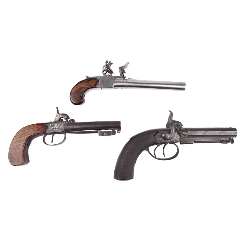 Three English muzzle loading pistols: the first a flintlock, turn off barrel 5 in., London proof, engraved box lock, folding trigger; the next a percussion conversion, barrel 4 in., folding bayonet, box lock; the last a double percussion pistol, side by side barrels 4 in., top rib indistinctly marked (Field... Holborn), London marks, engraved action, finely chequered grip, captive ramrod. [3]