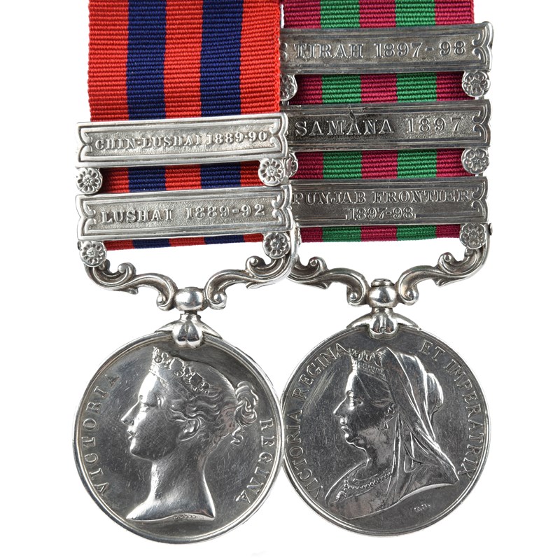 Two Medal to Rifleman Pancham Sing Negi, 2/2 Gurkha Regiment: India General Service 1854-95, 2 clasps: Lushai 1889-92, Chin-Lushai 1889-90 (501 Rifleman Pancham Sing Negi 2d Bn 2d Goorkha Regt); India General Service 1895-1902, 3 clasps: Punjab Frontier 1897-98, Samana 1897, Tirah 1897-98 (501 Rifln Pancham Sing Negi 2d Bn 2d Goorkha Regt), later mounted, edge bruising, good fine. [2]