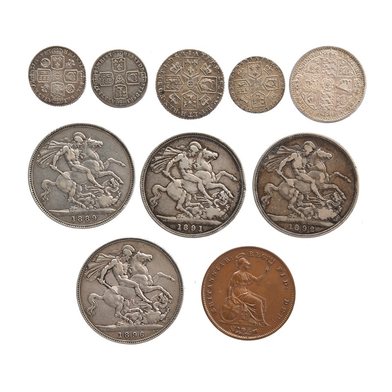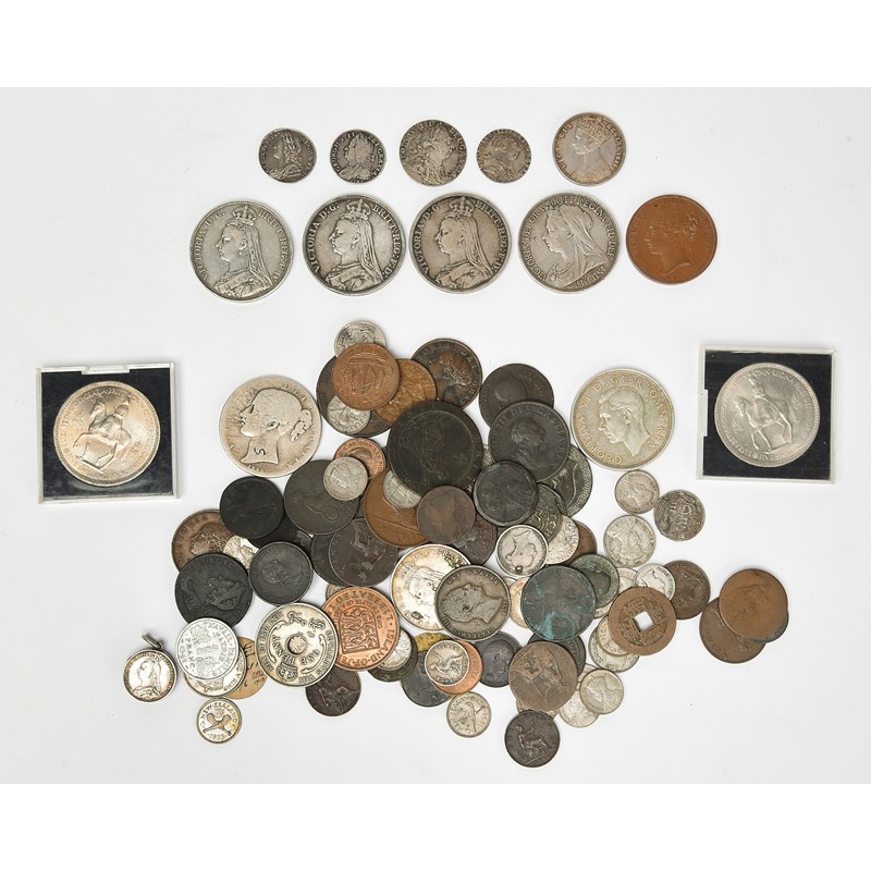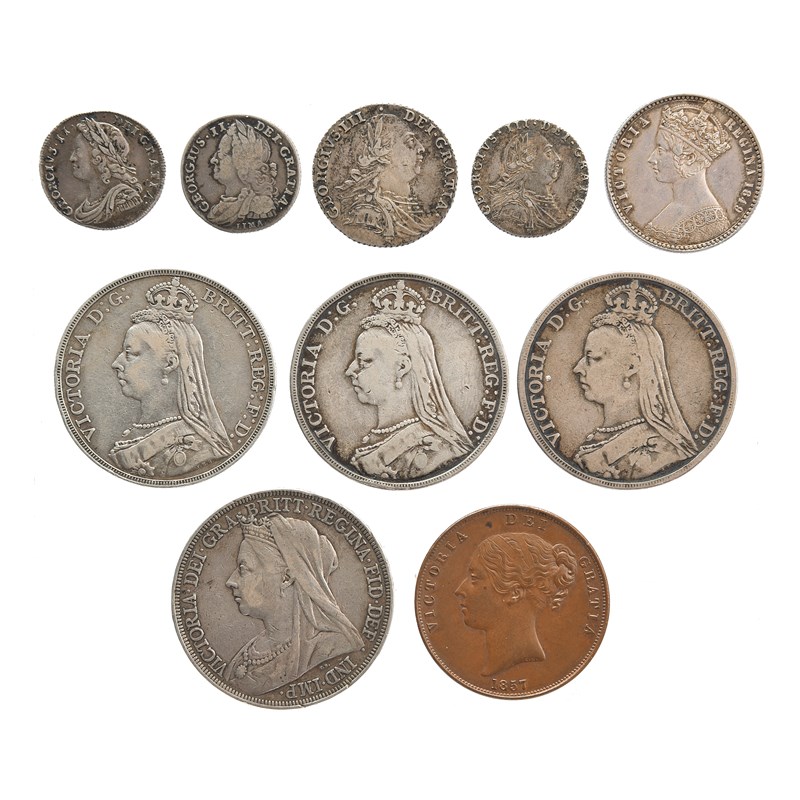 A quantity of Hanoverian and later coins, including: George II, silver sixpence, 1731, young bust, roses and plumes (S 3707), very fine or nearly so; silver sixpence, 1745, LIMA (S 3710), fine; George III, silver shilling, 1787, with semée of hearts (S 3746), very fine; silver sixpence, 1787, with semée of hearts (S 3749), very fine; Victoria, silver florin, 1849, 'godless' type (S 3890), very fine; silver crowns (3), 1889, 1891 and 1892, Jubilee issue (S 3921), the first very fine, the others nearly so; silver crown, 1896, veiled bust (S 3937), about very fine; copper penny, 1857 (S 3948), good very fine; and other coins, foreign and domestic, varying grades. [qty]