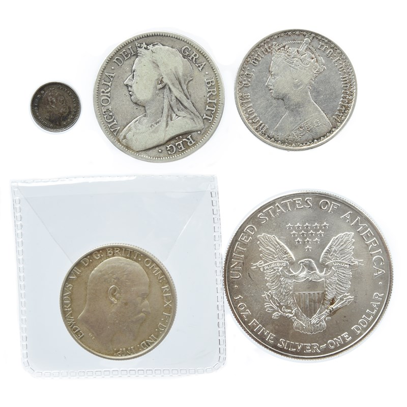 A small quantity of coins, including: William IV, silver three halfpence, 1834 (S 3839), very fine and toned; various Victorian silver coins, mostly just fine, Edward VII, silver florin, 1902 (S 3981), at least extremely fine; late pre-decimal issues, U.S. specimen type silver dollars, and other items. [qty]