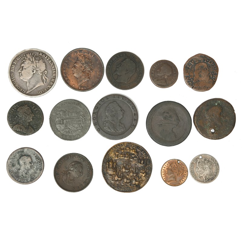 A small quantity of coins and medals, including: Capture of Portobello 1739, a pinchbeck medal, 39mm, Admiral Vernon full length standing by a cannon with sword and baton in hand, a ship in the background, rev. warships entering the harbour, date in exergue, very fine; George III, copper penny, 1797, second issue (S 3777), fine; halfpenny, 1799, third issue (S 3778), good fine; George IV, silver crown, 1821 (S 3805), about fine; and other items. [qty]