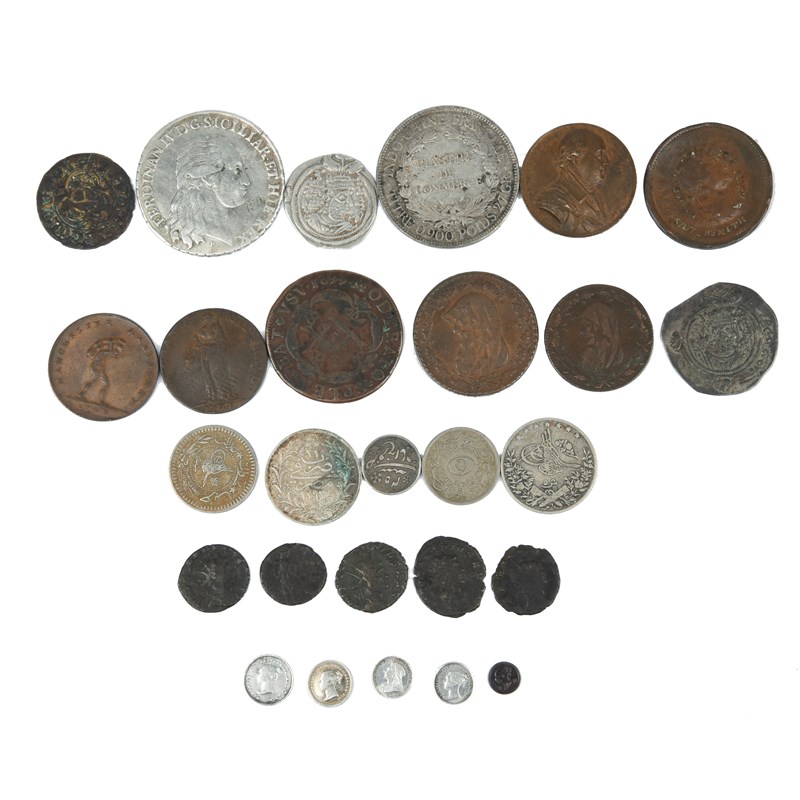 A small quantity of coins and tokens, including: Sassanian Kingdom: silver drachm (2), fine; Naples & Sicily: Ferdinand IV, silver piastra of 120 grana (KM C66b), fine; Britain: four 18th century copper token; five Roman bronze coins, radiate crowns; and other items. [qty]