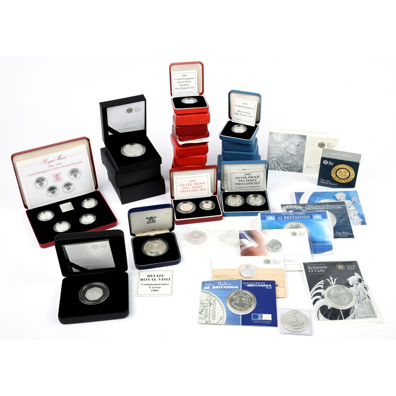 A collection of British silver proof and specimen coins, late 20th and 21st century, comprising: crown, 1977 Jubilee; Britannia five pounds (2), 2008, 2011; five pounds, 2010; two pounds (2), 1989 two-coin set; piedfort pounds (7), various dates; pounds (8), four being cased together in the 1984-87 set; fifty pence, 2020, withdrawal from the EU; ten pence (2), 1992 two-coin set; five pence (2), 1990 two-coin set; britannia two pounds (8), and pounds (2) various dates, in presentation envelopes; Belize royal visit commemorative crown, 1985; and a maundy set (4), 1957; mainly cased or in other original packaging, many with certificates, as struck or nearly so. [41]