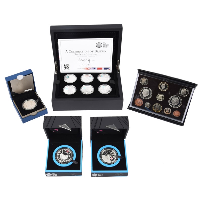 Elizabeth II: a quantity of silver and other proof coins, comprising: silver piedfort five pounds, 2012, Diamond Jubilee issue (S 4569); silver piedfort five pounds, 2012, Olympic commemorative issue; silver piedfort five pounds, 2012, Paralympic commemorative issue; silver five pounds (6) in the Royal Mint 'A Celebration of Britain' six coin set; and a proof set, 2008, eleven coins, five pounds to penny; all cased and boxed and with accompanying literature, all coins about as struck, some toning to the 2008 set.