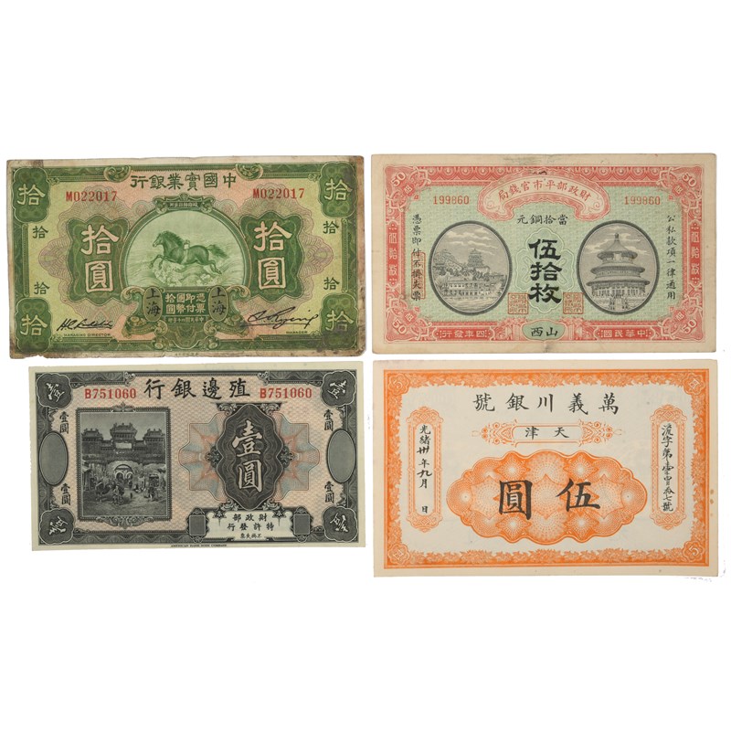 China: Qing Dynasty and Republic: four bank notes: Wan I Ch'uan Bank, five dollars, c. 1905 (SM W13-12), two small stains to margin, nearly extremely fine; National Industrial Bank of China, ten yuan, 1931 issue, Shanghai (Pick 533a), about fine; Bank of Territorial Development, dollar, 1915 issue, no place name (Pick 582r), minor graffiti in margin, nearly extremely fine; Market Stabilization Currency Bureau, fifty coppers (Pick 602), near very fine. [4]