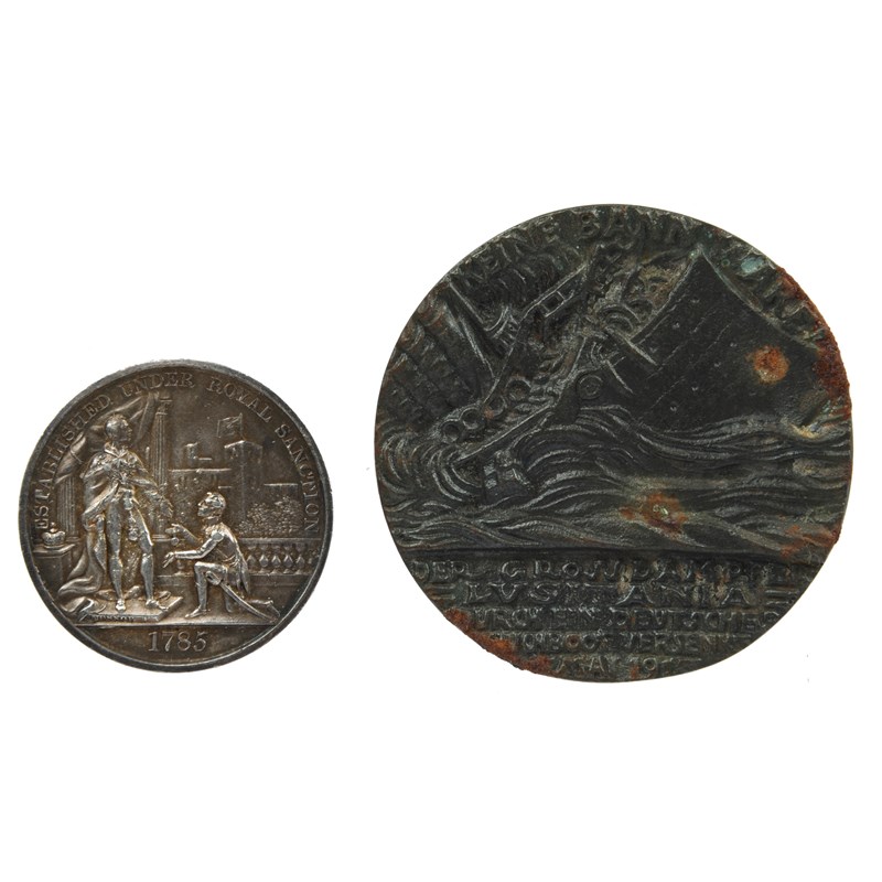A small quantity of medals and militaria, comprising: 22nd (Cheshire) Regiment of Foot, medal for 14 years good conduct, silver 35.6mm, King George III receives the medal from Colonel Crosby at Windsor, rev. text, extremely fine; a Lusitania medal, British replica after Göetz, with box and explanatory sheet; badges, buttons, medal ribbons, postcards, and other items. [qty]
