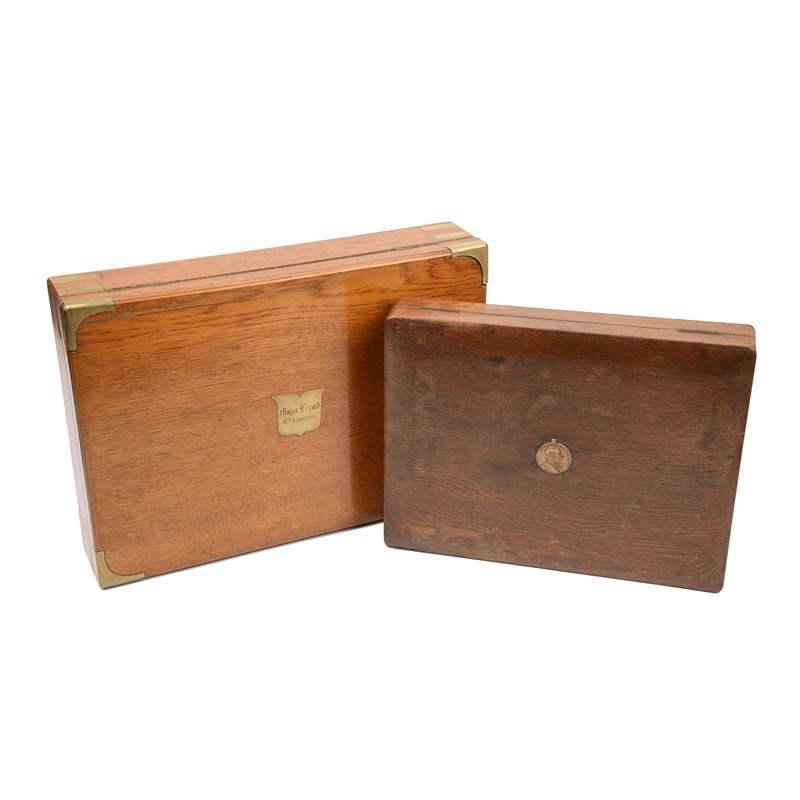 17th Lancers: a brass bound oak case, escutcheon to the lid engraved 'Major Legard 17th Lancers', re-lined interior with lift-out upper tray; together with an oak cutlery case, the lid set with an Austro-Hungarian medal, interior lacking dividers. [2]