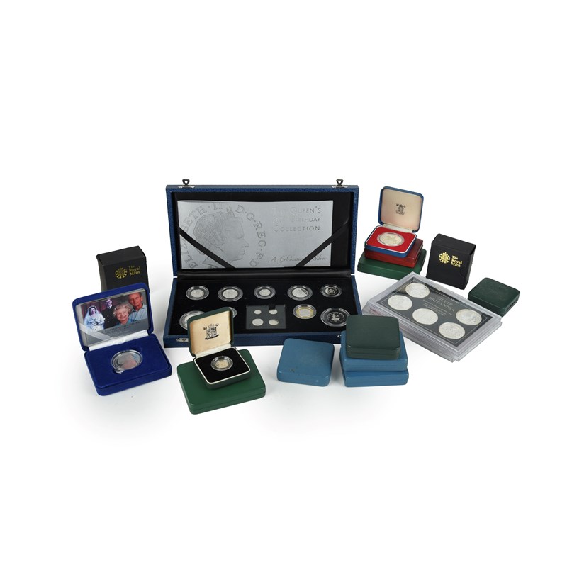 Elizabeth II, a quantity of silver proof coins in sets and as singles, including: The Queen's 80th Birthday Collection, 2006, thirteen coins, five pounds to penny including maundy set, cased with certificate; United Kingdon Silver Anniversary Collection, 1996, seven coins, pound to penny, cased with certificate and outer card box; Family Silver Proof Collection, 1995, three coins, two pounds (2) and pound, cased with certificate and outer card box; Diamond Wedding silver crown, 2007, cased with certificate and card slip; thirteen Britannia silver crown sized coins, in secondary retail packs with promotional inserts; eighteen other Royal Mint silver proof coins, cased singly or in pairs, some piedfort; and three other proof coins in capsules. [qty]