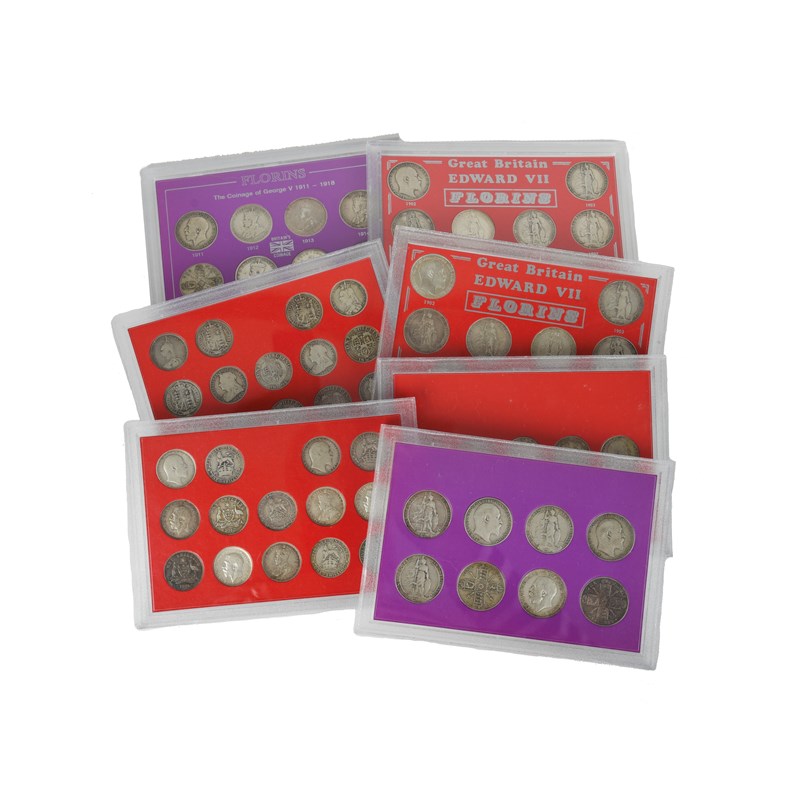 Victoria to George V, a collection of silver florins (34) and shillings (38), various issues and dates, circulated coins presented in modern perspex retail packs, some with promotional inserts, fine to near very fine. [72]