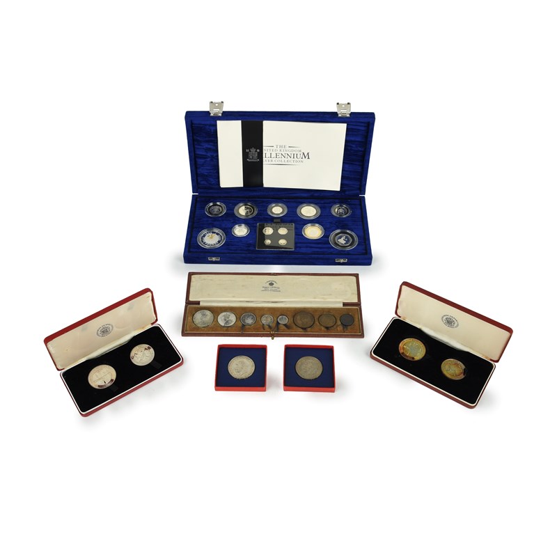 A small collection of proof sets and specimen coins, comprising: Great Britain, Elizabeth II, Millenium Silver Collection, 2000, thirteen silver coins, five pounds to penny including maundy set, cased with certificate and outer card box (PSS08), light toning to edges of fifty pence, otherwise about as struck; George V, crowns, 1935 (2), specimens in card boxes (S 4049), extremely fine; South Africa, George V, First Coinage of South African Mint Pretoria 1923, eight coins, half crown to penny, in Mappin & Webb case of issue, extremely fine; and two Icelandic silver two coin cased sets commemorating the 1,100th anniversary of the settlement of Iceland, 1974, each 1,000 and 500 kronur, one set with a certificate, good extremely fine or better, one set toned.