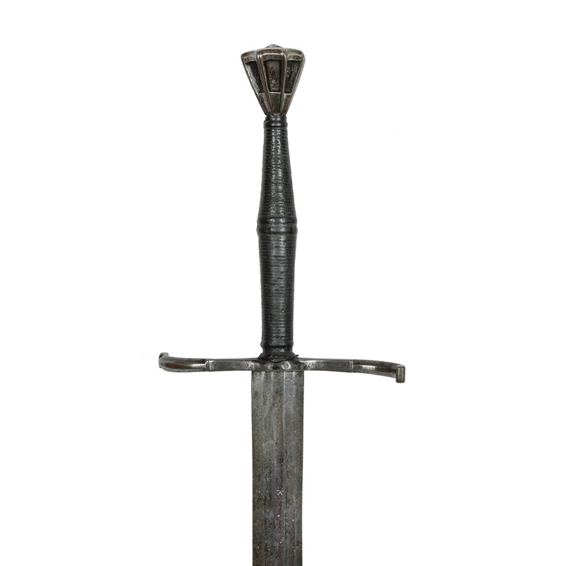 A very fine late 15th or early 16th-century North European hand-and-a-half arming sword, German or Flemish, multi-fullered blade 31 in. with reinforced point, struck with a six-pointed star to one side; hilt with swept cross describing an S-shape within the horizontal plane, the ends of the arms well finished with chamfered edges, the long leather bound grip swollen toward the centre, the inverted conical pommel with five broad flutes to the outer face - three of which are voided to accommodate enamelled ornaments (now lacking), the top with radial reeding extending down between the flutes, 1490-1510, Oakeshott type XX.4.