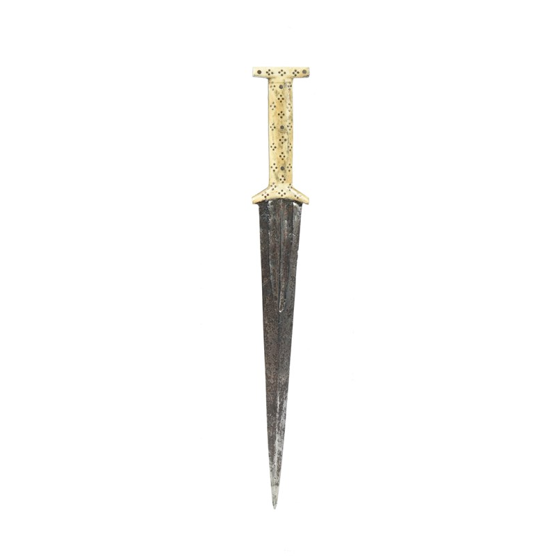A Swiss or German dagger (baselard), 15th century and later, triangular blade 9.5 in. with shallow medial ridge and broad converging fullers at the forte, I-shaped hilt with replacement bone grips fixed with rivets and with a repeated quatrefoil pattern of inlaid pellets.