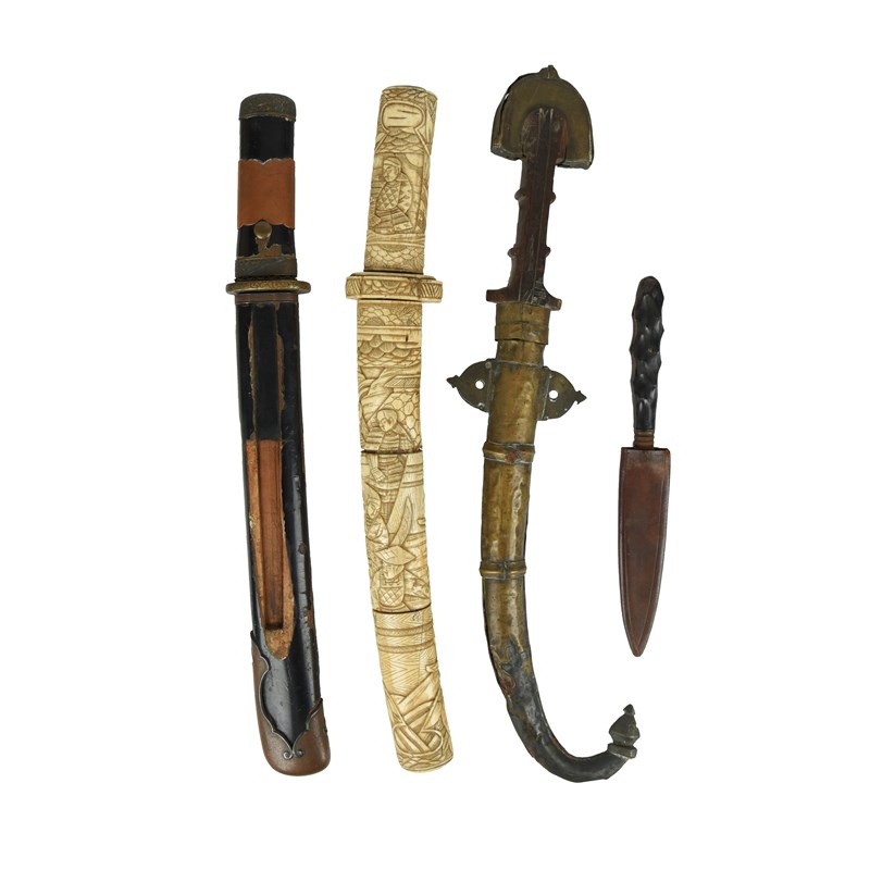 A small group of edged weapons, comprising: a Japanese dagger (tanto), blade 11 in., hira-zukuri, mumei, copper habaki, brass hamidashi-tsuba engraved with scrolling foliage, bark texture fuchi and kashira, saya set with an ornament of two kylin; a bone mounted tanto, the mounts carved with warriors; a Moroccan dagger (jambiya), curved blade, fan-shaped pommel, hooked scabbard; and a small dagger with a double-edged blade and a horn hilt. [4]