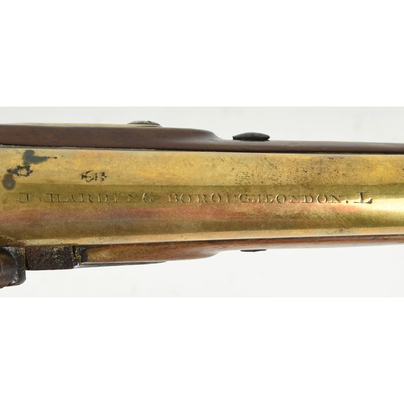 An English 22 bore percussion conversion holster pistol, slightly swamped brass barrel 8.5 in., top engraved 'J HARDING BOROUGH LONDON L', London proof, drum-and-nipple conversion from flintlock, plain lock plate with stepped tail and safety bolt, walnut full stock with brass furniture, brass tipped wooden ramrod. Section 58(2) - no licence required if possessed as a curiosity or ornament.