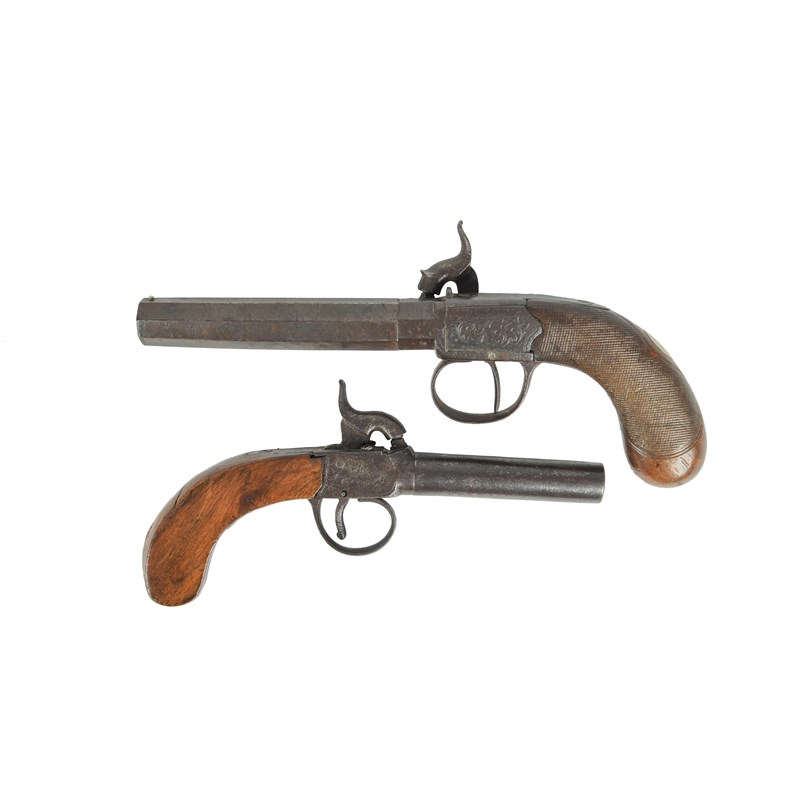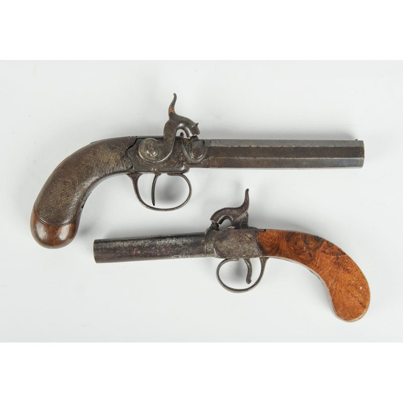 An English 70 bore percussion pocket pistol, hexagonal turn-off barrel 4.25 in., bead fore-sight, Birmingham proof, scroll engraved box lock with back sight, chequered walnut grip; together with another similar pistol, round barrel 3 in., figured flat-sided grip. [2] Section 58(2) - no licence required if possessed as a curiosity or ornament.