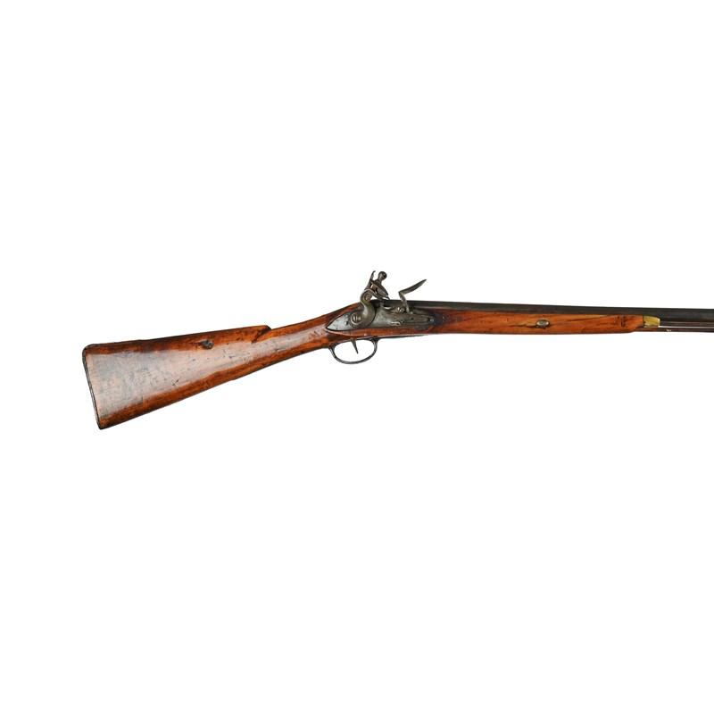 A flintlock sporting gun, octagonal barrel 40 in., hooked breech, plain lock with swan-necked cock, brass side plate, half stock with steel trigger guard, horn-tipped wooden ram rod.