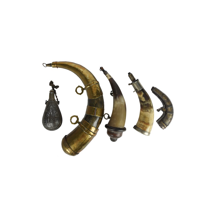 A small collection of powder flasks, comprising: an Omani silver flask, horn-shaped, edged and banded with studded strapwork, overlaid with repoussé floral panels, sprung shutter lever of iron conforming to the inner curve, 17cm; an English flask of polished cattle horn, graduated measuring spout by Sykes with sprung shutter, 24 cm; another horn flask, with domed wooden base plug and wooden stopper, 28 cm; a large horn priming flask, clad in brass with exposed sections of polished horn to the centre, brass engraved with foliate and geometric details, two suspension rings, 36 cm.; and a French pewter flask, pear shaped with relief decoration of a Druid's face to one side and a witch to the other, 15 cm. [5]