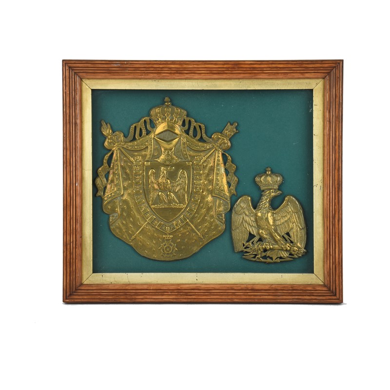 France - First Empire: a brass sabretache plate of an officer of the Imperial Guard, Imperial coat of arms with an eagle to a shield at the centre, the chain of the Legion de Honneur around, Imperial mantle with bees, crossed sceptres of justice and mercy, the crest a helmet surmounted by the imperial crown, 17 x 15 mm; together with a brass Imperial Guard cartridge box badge, a crowned eagle with lightning bolts; presented together in a glazed frame. [2]
