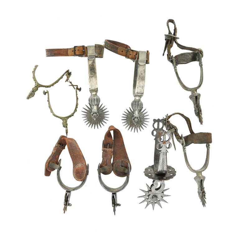 A collection of 19th century South or Central American rowel spurs, comprising: i) a pair, white metal, plain heel bands with leather straps, necks of fluted baluster form, large iron rowels with close-set spokes; ii) a pair, white metal, heel bands decorated with chevrons, leather straps, ornate necks, multi-spoke iron rowels; iii) a pair, all-steel, thick heel bands cut with diagonal lines, leather straps, flat necks, rowels each with eight short spokes; iv) a pair, gilt-metal, heel bands and necks with ornate foliate decoration in relief, necks terminating in boars' heads (one incomplete), small iron rowels with triangular spokes; v) a single steel spur, large pierced roundel between the heel band and the openwork decorated neck, large pierced rowel. [9]