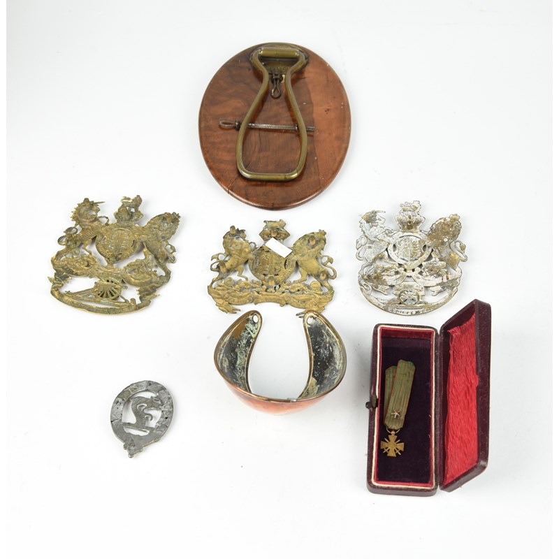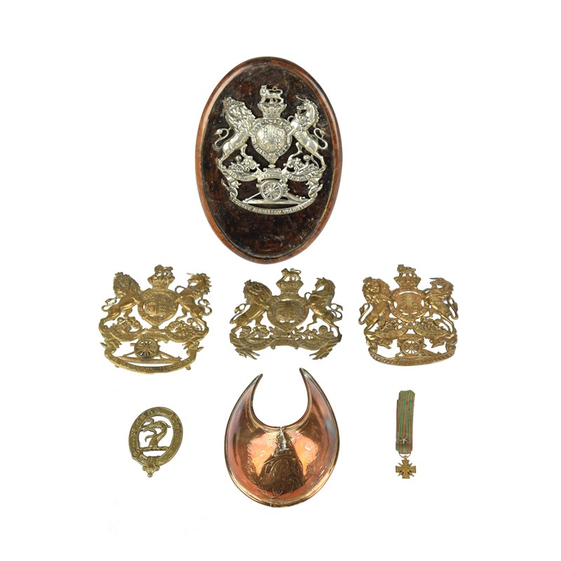 A small collection of militaria, comprising: a George III copper officer's gorget, of characteristic deeply curving crescent-shape and engraved with the royal cypher; a scarce Dorset Artillery Volunteers helmet plate, silver-plated brass, mounted for display on an oval wooden easel stand; three Victorian Royal Artillery brass helmet plates; a livery badge displaying a crest in the form of a serpent devouring a smaller such beast all encircled by an oval garter with the motto 'YE GRET POVL'; and a French dress miniature Croix de Guerre. [7]