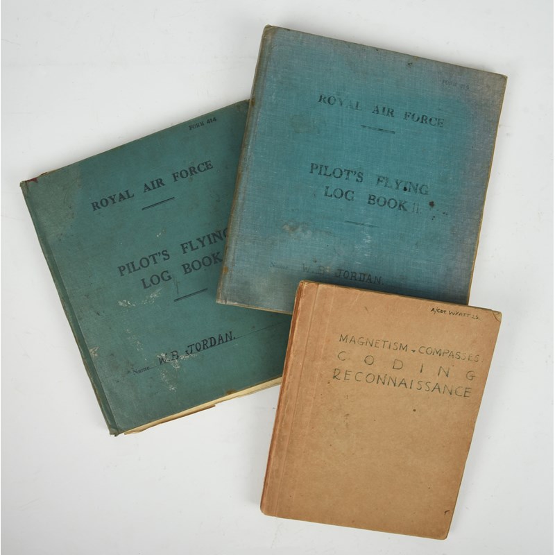 Two Second World War Royal Air Force Pilot's Flying Log Books, kept by 1315995 William B. Jordan, the record commencing in November 1941 with training in Miles Magisters flying from E.F.T.S. Kingstown, Carlisle, and concluding in September 1945 with 126 Persian Gulf Squadron flying North American Mustang IVs, including also service with 276 Squadron at Portreath (air-sea rescue); together with an exercise books, Air Cadet J. S. Wyatt, 'Magnetism Compasses coding Reconnaissance'. [3]