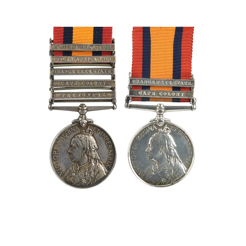 A Queen's South Africa Medal to Private Thomas Williams, 6th (Inniskilling) Dragoons, first type (b), 2 clasps: Cape Colony, Orange Free State (3118. Pte. T. WILLIAMS. 6. Drgns), engraved, ghost dates, much polished, good fine; together with another Queen's South Africa Medal to Private E. Twinn, Volunteer Company Middlesex Regiment, second type, 5 clasps: Transvaal, Cape Colony, Orange Free State, South Africa 1901, South Africa 1902 (8407 PTE. E. TWINN, VOL: COY MIDDX: REGT), impressed, good very fine or better. [2]