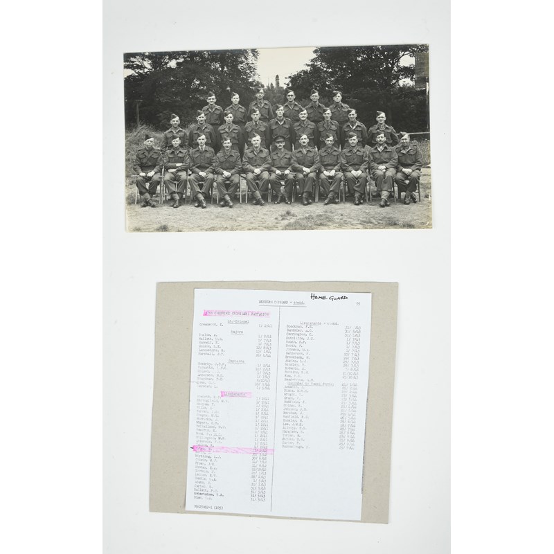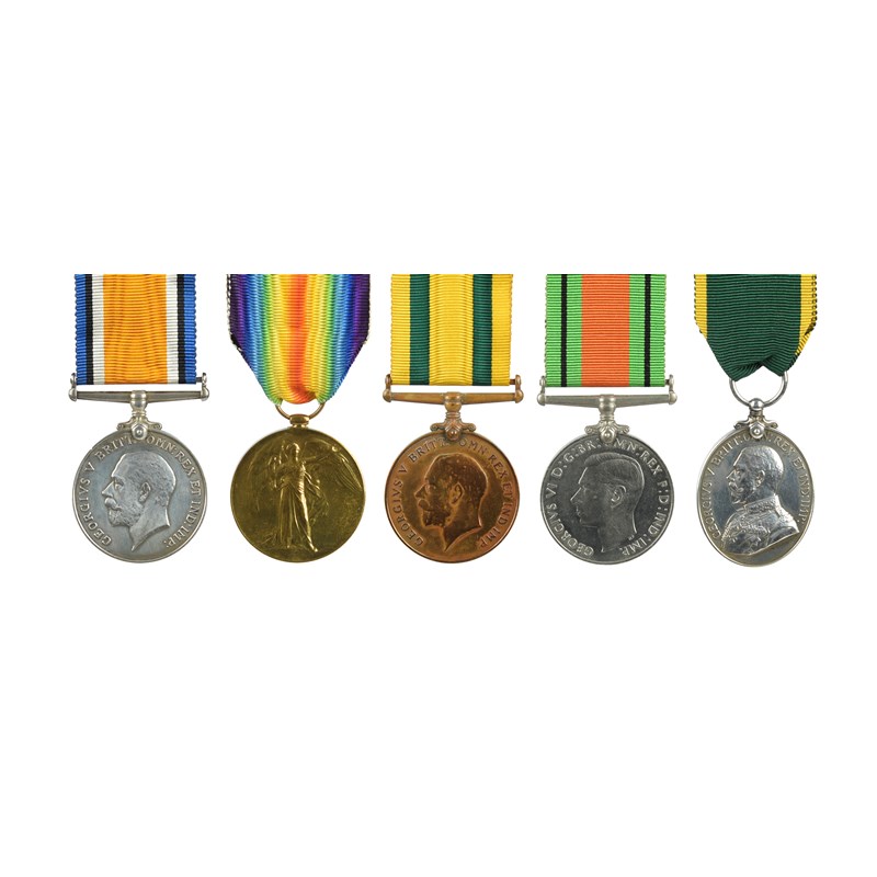 A scarce group of five medals named or attributed to Lieutenant H. Yates, Royal Flying Corps, Royal Air Force, Lancashire Fusiliers and Home Guard: British War Medal 1914-20 and Victory Medal (403219. SGT. H. YATES. R.A.F.); Territorial Force War Medal (403219 SJT. H. YATES. R.F.C.); Defence Medal, unnamed as issued; Territorial Efficiency Medal (380 SJT H. YATES. LAN. HRS.); good very fine or better, [5]; together with a photograph of a home guard unit with label identifying an officer seated in the centre of the front row as Yates.