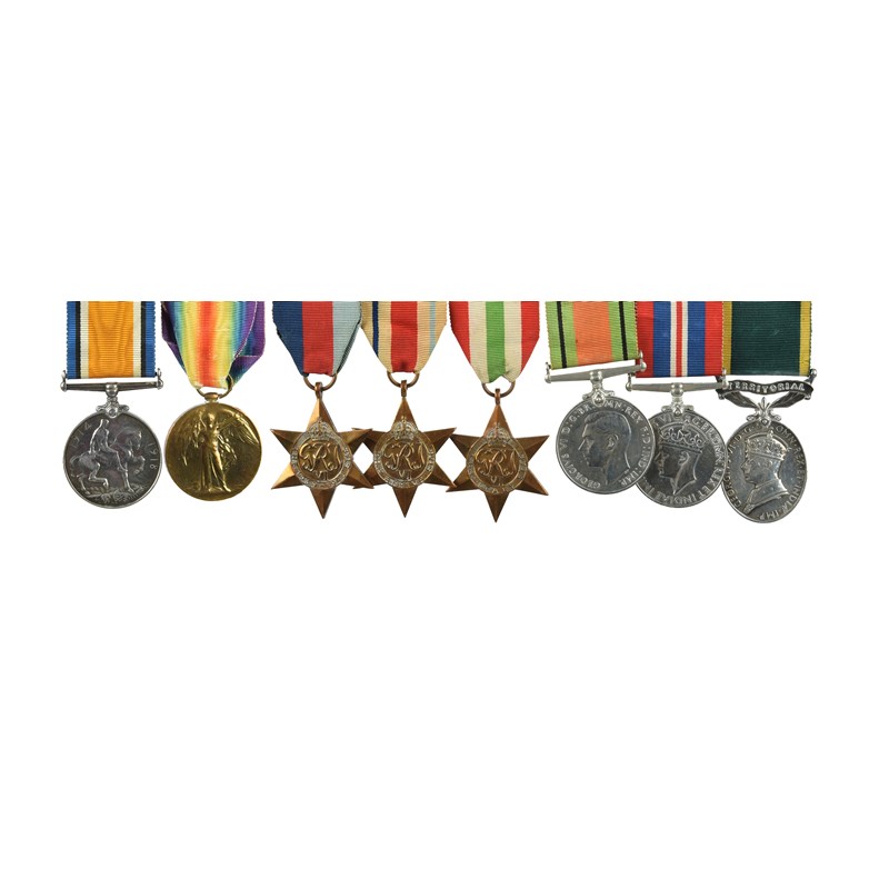 Two medal groups carrying a presumption of a familial connection, comprising: a Great War Pair to Private Reginald J. Taylor, 21st Battalion London Regiment: British War Medal 1914-20 and Victory Medal (657006 PTE. R. J. TAYLOR. 21-LOND.R.); and six to Corporal R. S. L. Taylor, (London Irish Rifles) Royal Ulster Rifles: 1939-45 Star, Africa Star, Italy Star, Defence Medal, War Medal 1939-45, George VI Efficiency Medal (Territorial) (7012964 CPL. R. S. L. TAYLOR. LOND. IR. RIF. R. U. RIF.); both groups swing mounted, much edge bruising, otherwise very fine. [8]