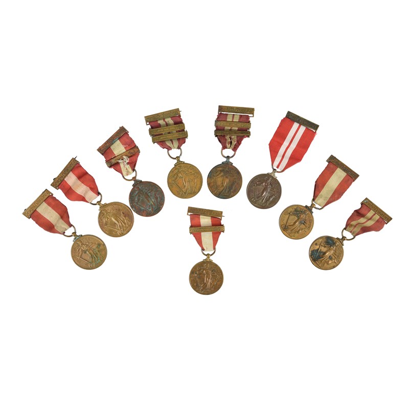 Ireland - Free State: a collection of Emergency Service Medals 1939-46, comprising: Army/Air Corps/Navy issue (2), each with two clasps; Local Defence Force Issue (4); Volunteer Aid (Red Cross) issue; and Local Security Force Issue (2), each with one clasp; all with ribbons and top brooches, fine to very fine, much wear to ribbons. [9]