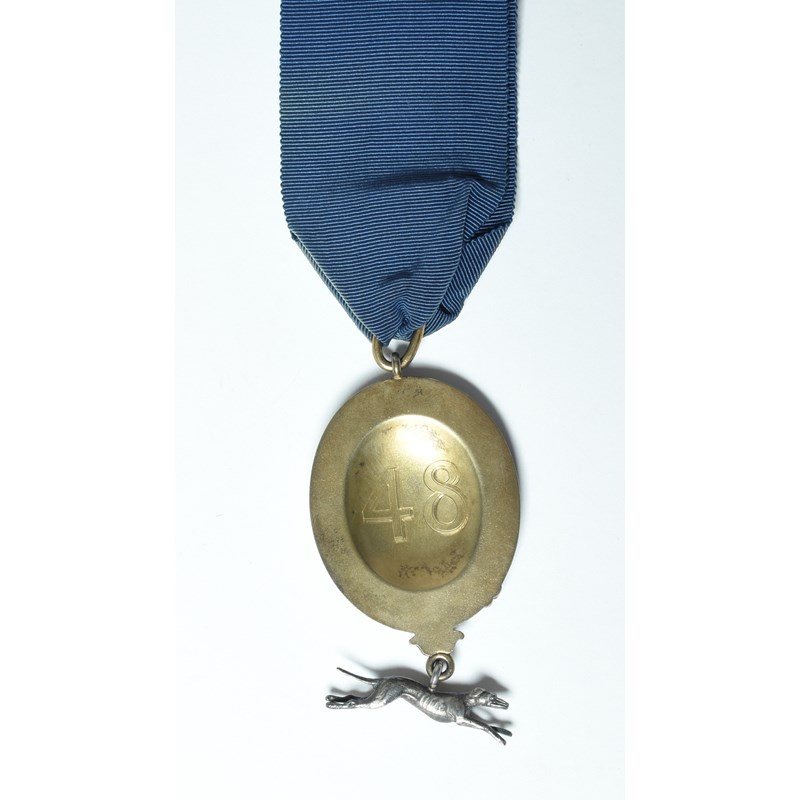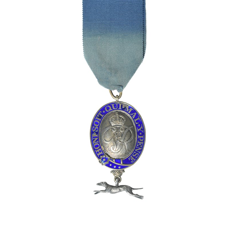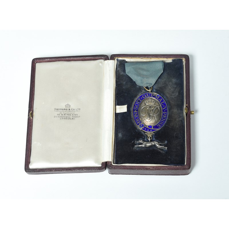 A George VI King's Messenger's Badge, silver, silver-gilt and enamel, the oval badge with convex centre bearing the crowned royal cypher in relief, bordered by a garter with the motto of the Order of the Garter in silver to a blue enamel ground, reverse engraved '48', below the badge a pendant silver greyhound running left, suspended from its original garter blue riband and in its original fitted case by Garrard & Co., small areas of enamel damage to right of suspension and on buckle of garter, some wear to gilding, good very fine or better.