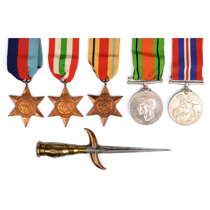 Five Second World War campaign medals: 1939-45 Star, Africa Star, Italy Star, Defence Medal and War Medal; together with a 'trench art' miniature dagger, composed of a British general service button (pommel) a French 8mm Lebel case (hilt) an aerial flechette (blade) and two 8mm bullets (quillons).