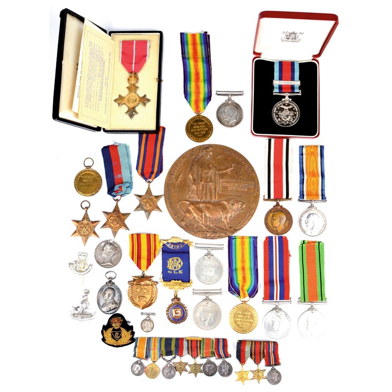 A small collection of medals, including: O.B.E. (Military), attributable to Lt-Col William T. Forsdyke, R.A.S.C., cased with transmission slip, toned, extremely fine; a Great War pair and Memorial Plaque to Charles Victor Roy Tuck, Oxford And Bucks Light Infantry (30118 PTE. C.V.R. TUCK. OXF. & BUCKS. L.I.), good very fine; a Great War Pair (110194 GNR. R.V. TRAVERS. R.A.), very fine; a Territorial Force Efficiency Medal, George V (203895 SJT: R.J. HAMBROOK. 4/ ESSEX R.), nearly extremely fine; two mounted miniature groups; and other items.