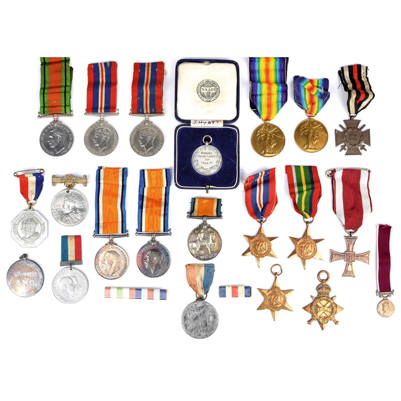 A 1914-15 Star (DMR. W.J. HAMILTON. HAMPS. R.), three British War Medals 1914-20 (88282 HOBBS R.A.F., 58944 HARVEY NORTH.N R., 2055 HAMMOND R.A.), two Victory Medals (R 2323 COOPER R.N.V.R., 408979 WILLIS R.A.F.); together with a small quantity of other medals.