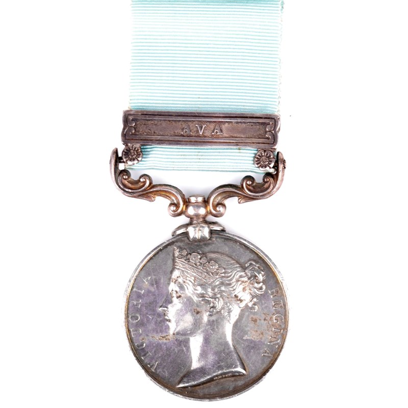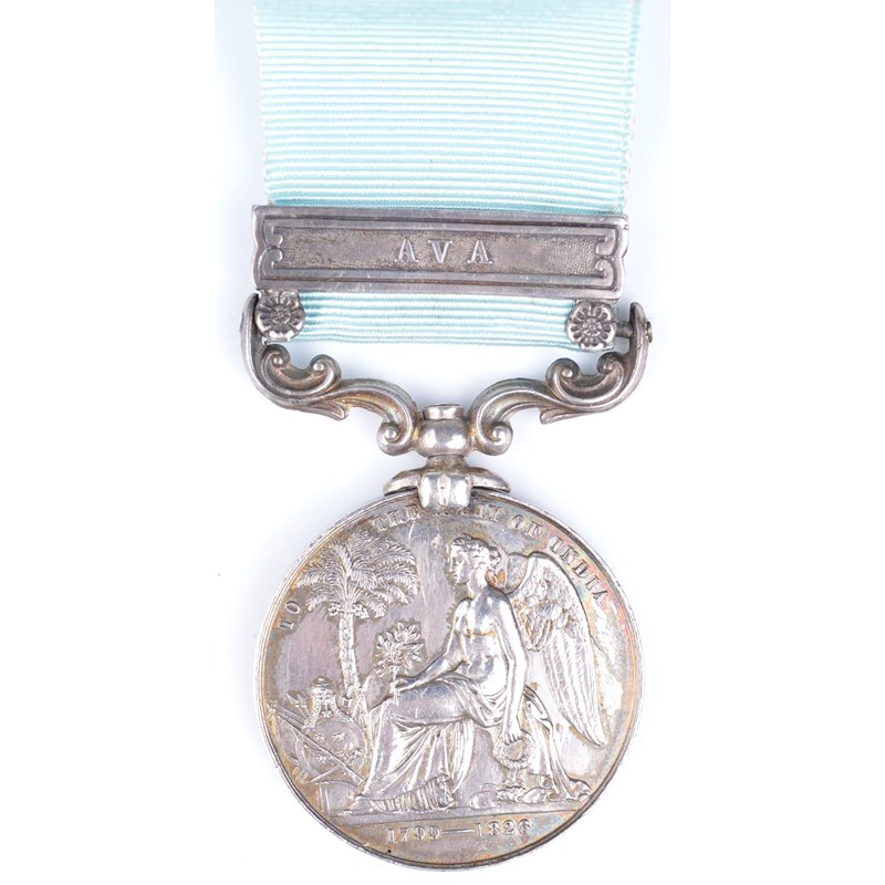 An Army of India Medal, renamed to Jamadar Tucket Ram, Nizam's Artillery, clasp, Ava (JAMADAR TUCKET RAM NIZAMS ARTY) renamed in engraved serif capitals, long hyphen reverse. Good very fine or better, bar re-attached.