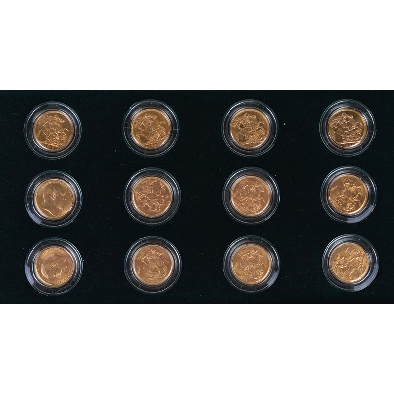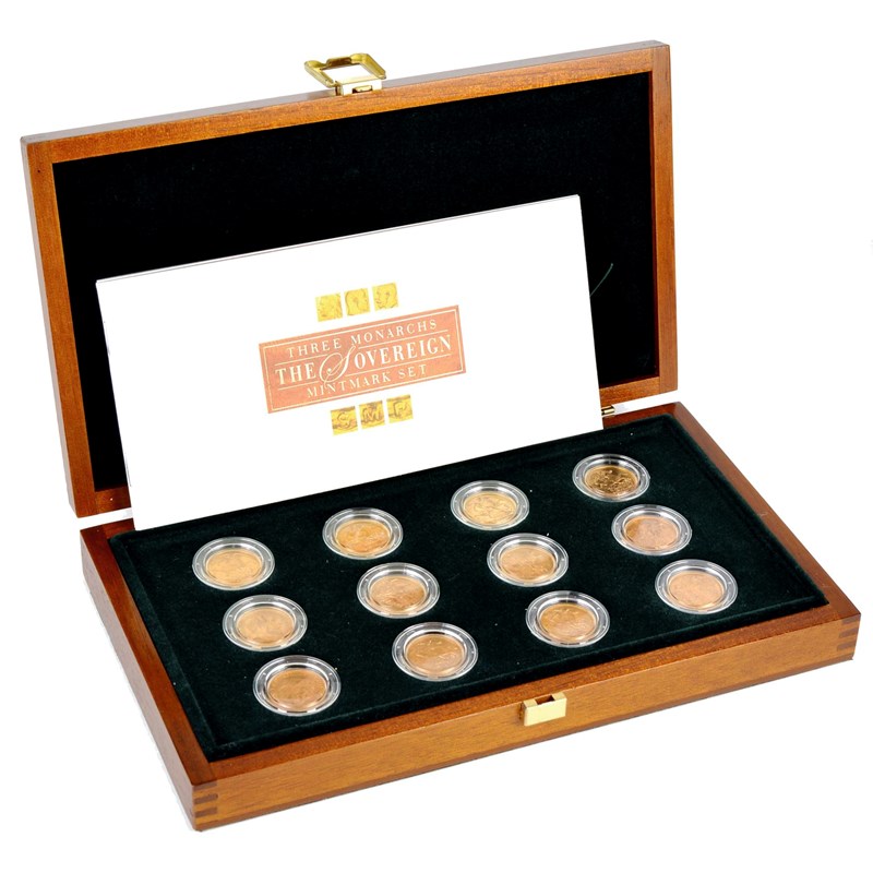 Victoria to George V, a cased collection of twelve circulated gold sovereigns, four for each monarch (various dates from 1899-1918), each group of four comprising an example produced at the Royal, Melbourne, Sydney and Perth mints; issued by the Royal Mint as the 'Three Monarch Mintmark' set, with certificate and promotional booklet, conditions vary, some signs of possible cleaning. [12]