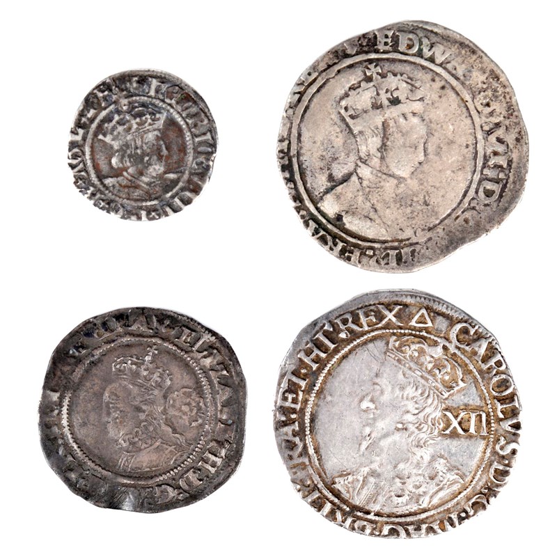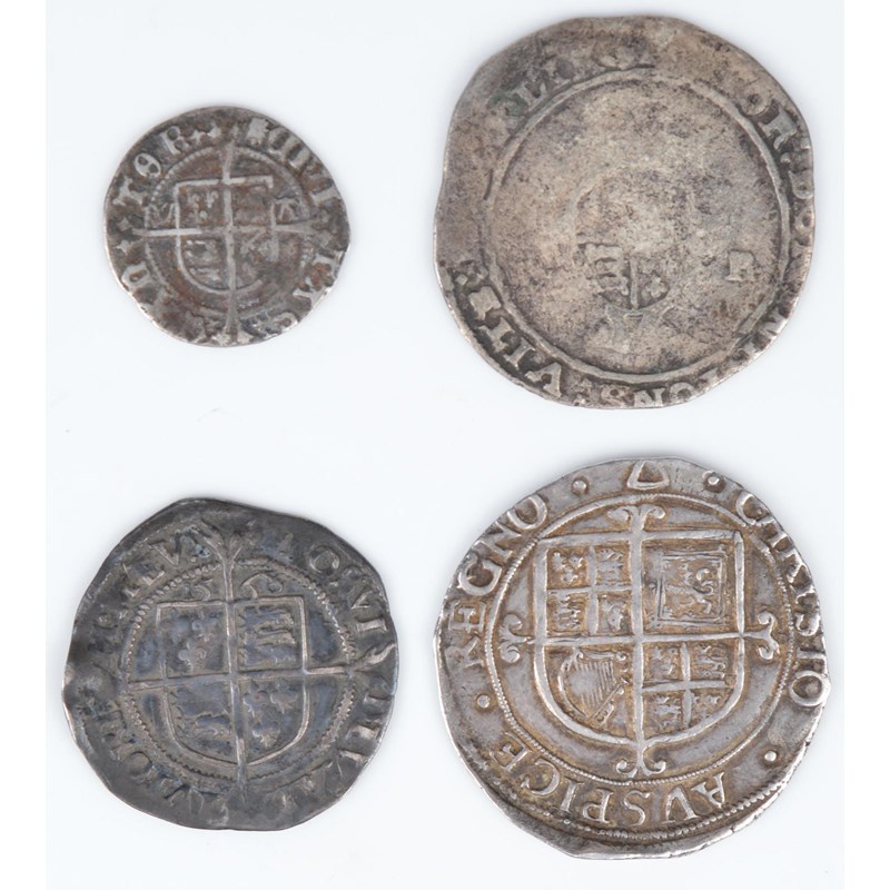 Four hammered coins: Henry VIII (1509-47), silver half-groat, Canterbury, R. CIVITAS CANTOR WA, mm 121 (S 2343); Edward VI (1547-53), silver shilling, mm appears to be TC monogram (Bristol); Elizabeth I, silver sixpence, 1568, small flan, rose and date, mm coronet; Charles I, (1625-49), silver shilling, Briot's bust, mm triangle (1639-40); the second about fair, the others fine, some degree of clipping to each.[4]