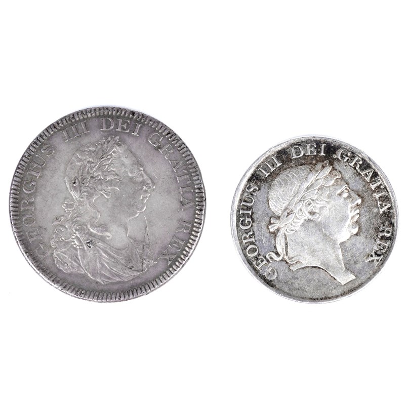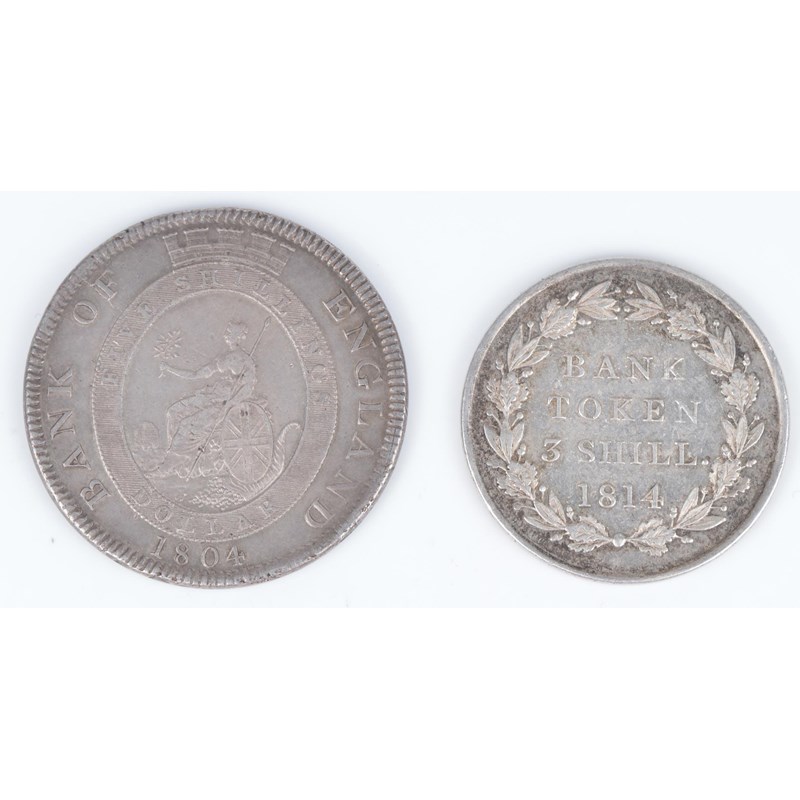 George III, Bank of England issue (1804-16): silver dollar, 1804 (S 3768), good fine or better; silver three shillings, 1814, second head (S 3770), very fine. [2]
