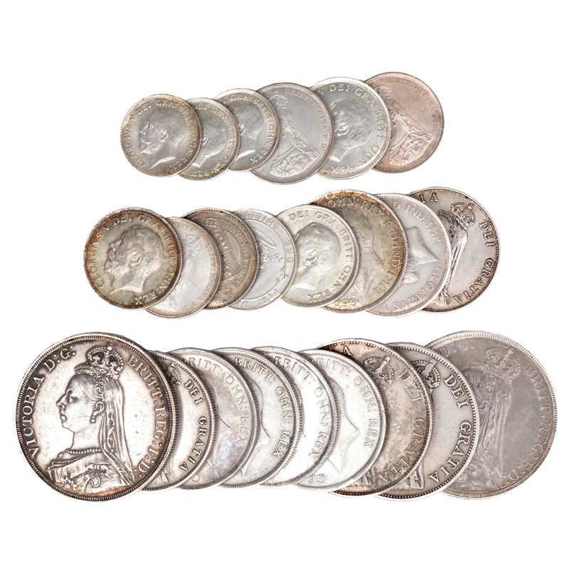 A collection of British silver coins, comprising: Victoria: crowns (2), 1887, jubilee bust, very fine and nearly so; double florin, 1887, Roman I, nearly extremely fine or better; double florin, 1889, Arabic 1, fine; halfcrown, 1887, very fine; Florin, 1887, very fine; shillings (4), 1887, small head, all about extremely fine; Edward VII: shilling, 1910, nearly extremely fine; George V: halfcrowns (4), 1915, 1916, 1917 and 1918, fine, very fine, very fine and fine; florins (2), 1916 and 1919, nearly extremely fine and very fine; shillings (3), 1915, 1916 and 1916, all about extremely fine; sixpences (3), 1916, extremely fine [23]