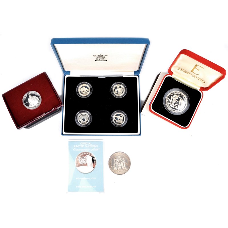A collection of modern silver proof and commemorative coins, comprising: Britain: 1986, Queen Elizabeth 60th Birthday crown sized medal(unofficial, hallmarked); peidfort two pounds, football, 1996 (S 4317); one pound (4) silver plain edged pattern collection, 2003, hallmarked, all cased and as struck; together with: France: fifty francs, 1976; Bahamas: Fiftieth Anniversary of Independence, ten dollars, cased; U.S.A.: George Washington Half Dollar, 1983, cased; United Nations Fortieth Anniversary, 1985, encapsulated crown sized medal. [10]