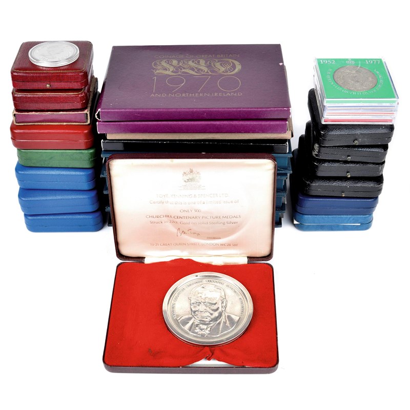 A collection of British proof sets and commemorative issues, mainly post-decimal, mainly in cases of issue; together with various commemorative and prize medals, including: Toye Kenning and Spencer, silver box medal, Winston Churchill centenary of birth, containing 13 printed cards depicting the important events of his career, cased; Red Poll Cattle Society of Great Britain and Ireland, five silver prize medals, cased; and other items.