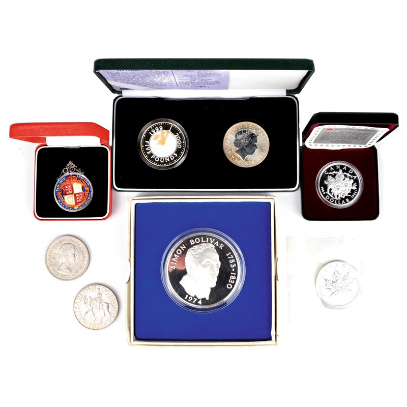 A small quantity of coins, including a 2000 proof five pounds; a Canadian dollar, 1994; an enamelled half crown in loose mount, 1916; and other items.