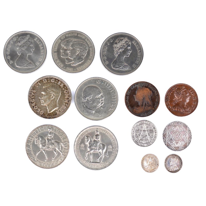 George III, copper Penny, 1772, first issue (S 3774), near very fine; George VI, silver Crown, 1937, .500 fine (S 4078), very fine; and a small quantity of commemorative crowns and other base metal coins. [13]