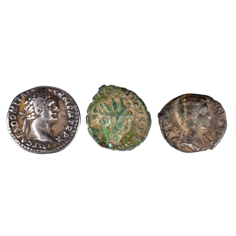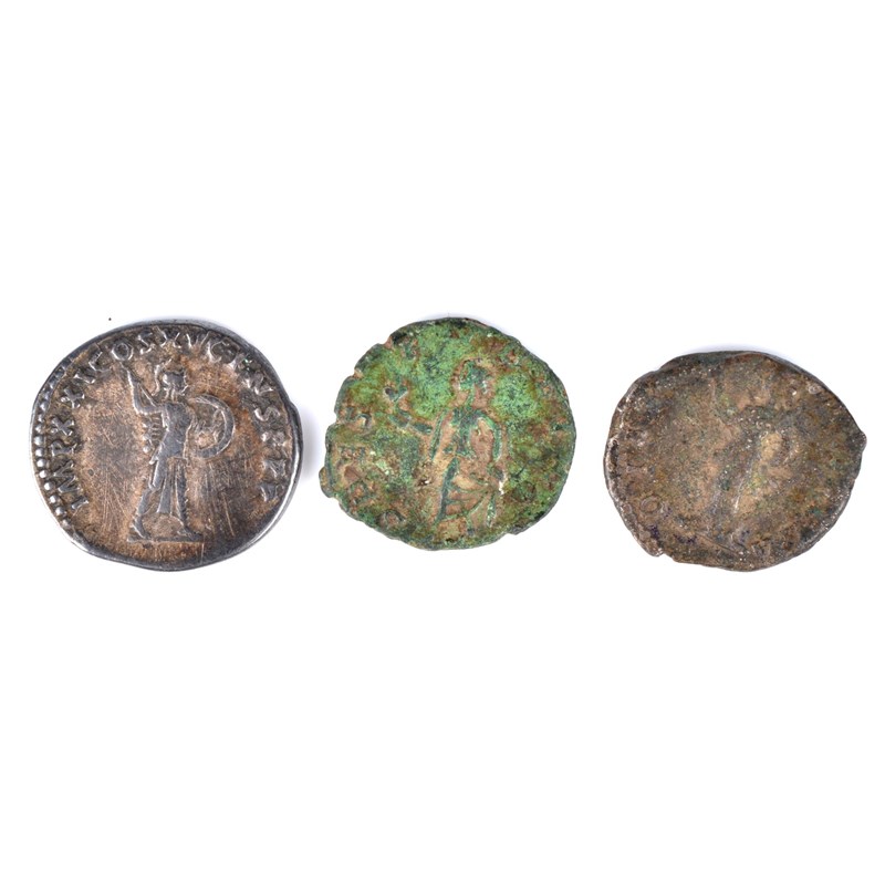 Roman Britain, Domitian (81-96), silver denarius, rev. IMP XXI COS XV CENS PPP, near fine; Tetricus (270-273), small bronze coin, 17mm, near fine; and another small bronze coin (Julia Augusta?), 16mm, fair. [3]