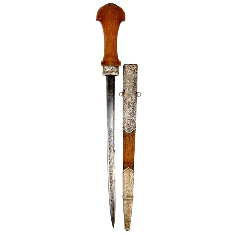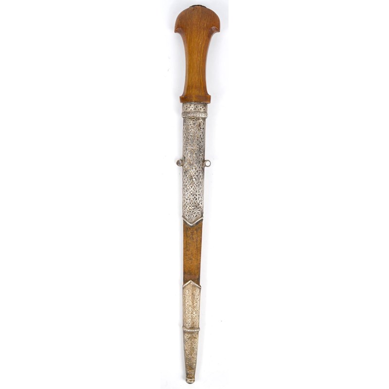 ‡ A Moroccan dagger, slender 13.5 in. blade adapted from a European sword, etching to the broad central fuller, narrow back fuller and reformed 7.5 in. false back edge, rhinoceros horn hilt of characteristic form with waisted grip rising to a fan shaped terminal, silver repousse collar and scrolling pommel ornament, silver repousse mounted scabbard with body of fabric covered wood, the long chape and locket richly decorated with foliate scrolls, 19th Century.