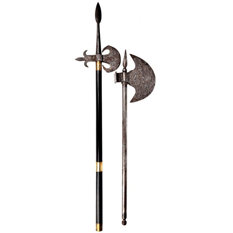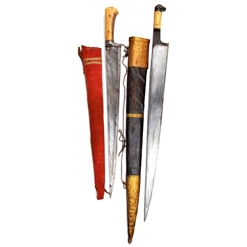 A Khyber knife, T-section blade 23 in., three stage grip with horn and bone scales (lower scales missing), brass mounted scabbard; a similar knife, blade 2.5 in., bone grips, velvet covered scabbard; an all steel Indian style axe, the crescent head with arabic text in light relief; and another axe, etched head with trefoil paen, spear point, wooden haft. [4]