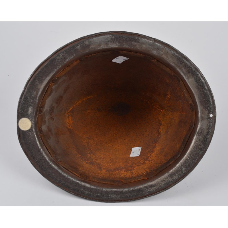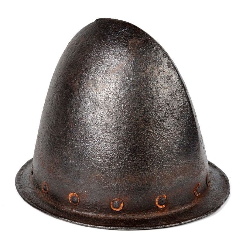 An Italian helmet (cabasset), in the 17th Century style, high skull with diminutive 'stalk', the base set with rivets and rosette washers, the narrow brim struck with indistinct armourer's mark.