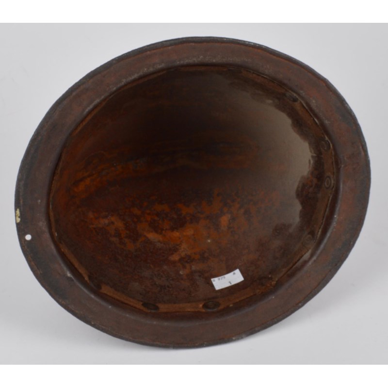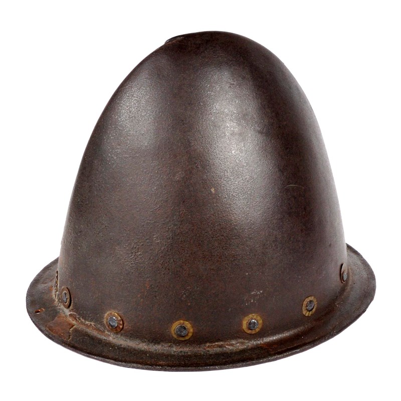 An Italian helmet (cabasset), in the 17th Century style, high skull with diminutive 'stalk', the base set with rivets and rosette washers, the narrow brim struck with indistinct armourer's mark.